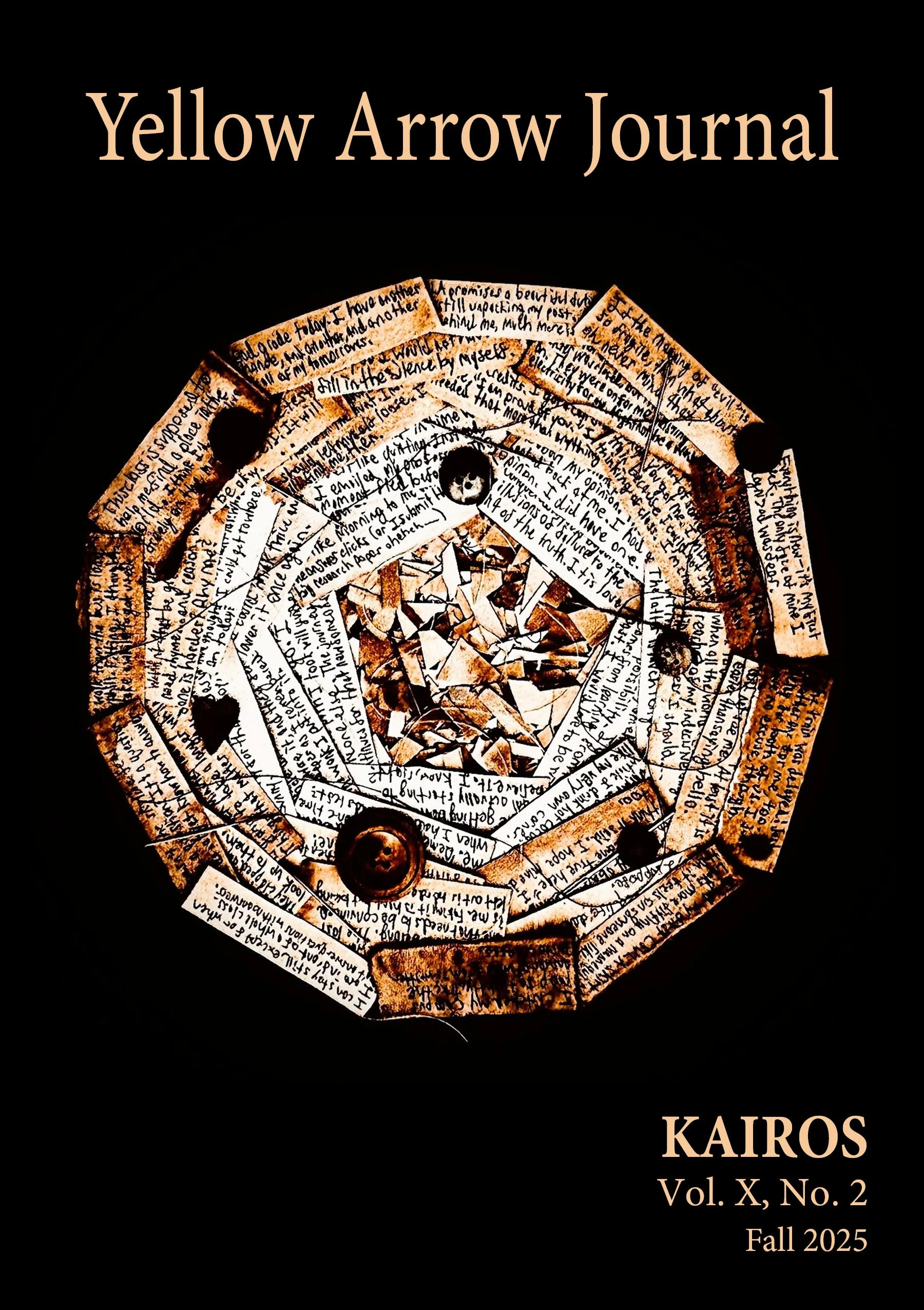 Make sure to take your time exploring Clara’s beautiful mixed-media collage, “The Awakening Aperture,” on the cover of KAIROS. According to Clara, “The circle (inspired by the aperture of a camera, or the lens that captures a fleeting fragment of time) is composed of pieces of the diary of a fictional college student experiencing college life, from the day she is accepted to the school to her graduation. Her initial doubt is reflected by the moody outer rim of the circle, and as she opens herself to the brightness of college, she starts to appreciate her life more fully.” Thank you, Clara, for sending us your artwork and for letting us showcase it to our community.