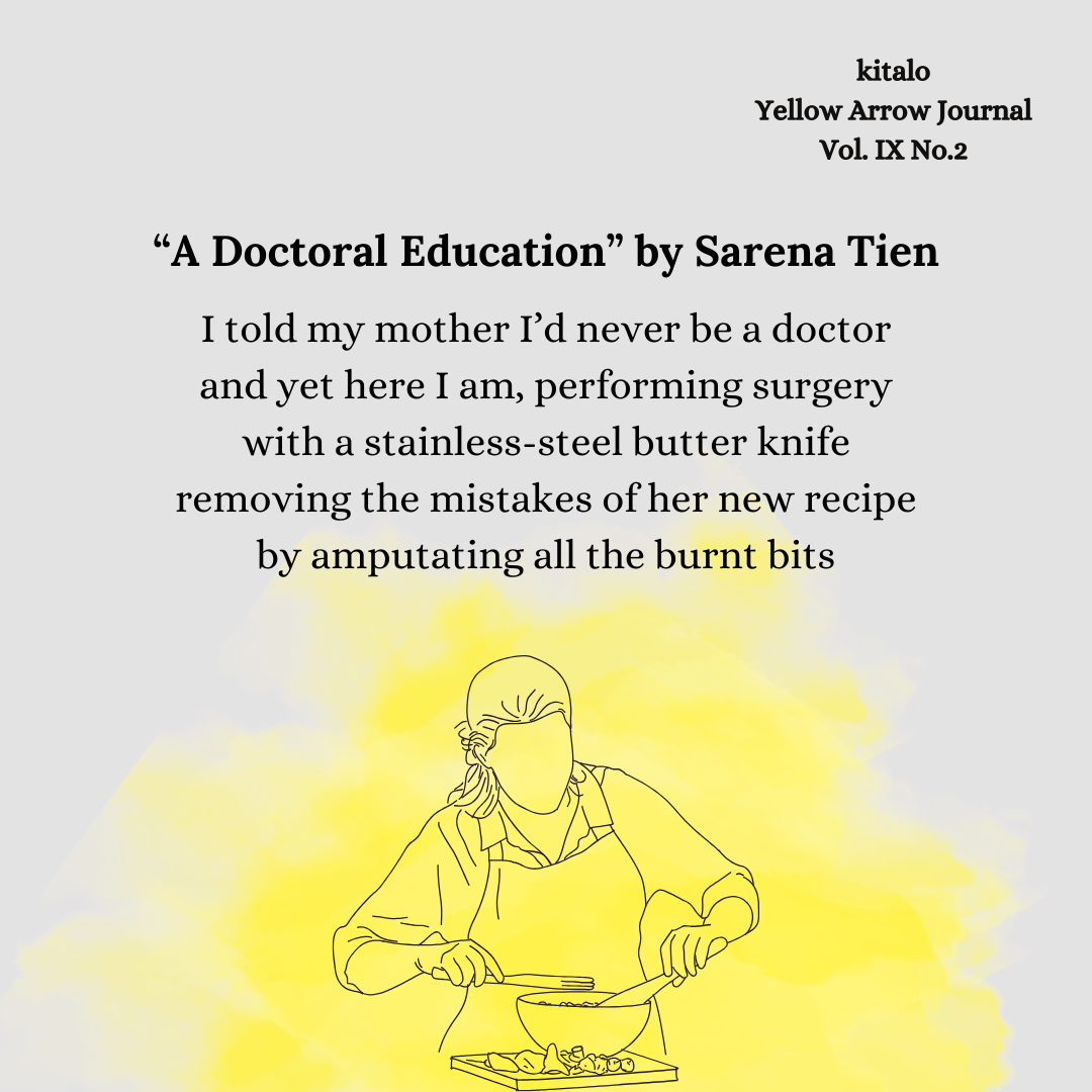 Yellow Arrow published Tien’s piece “A Doctoral Education” in Yellow Arrow Journal, Vol. IX, No. 2, kitalo. You can find her online on BlueSky @sarendipitous.bsky.social, and at sarenatien.com.