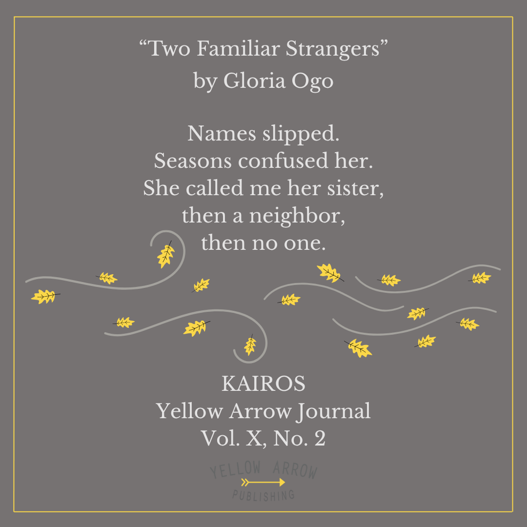 Yellow Arrow published Gloria’s piece “Two Familiar Strangers” as the foreword to Yellow Arrow Journal, Vol. X, No. 2, KAIROS. You can find her online on Facebook @gloria.ekedum and at glriaogo.wixsite.com/gloria-ogo.