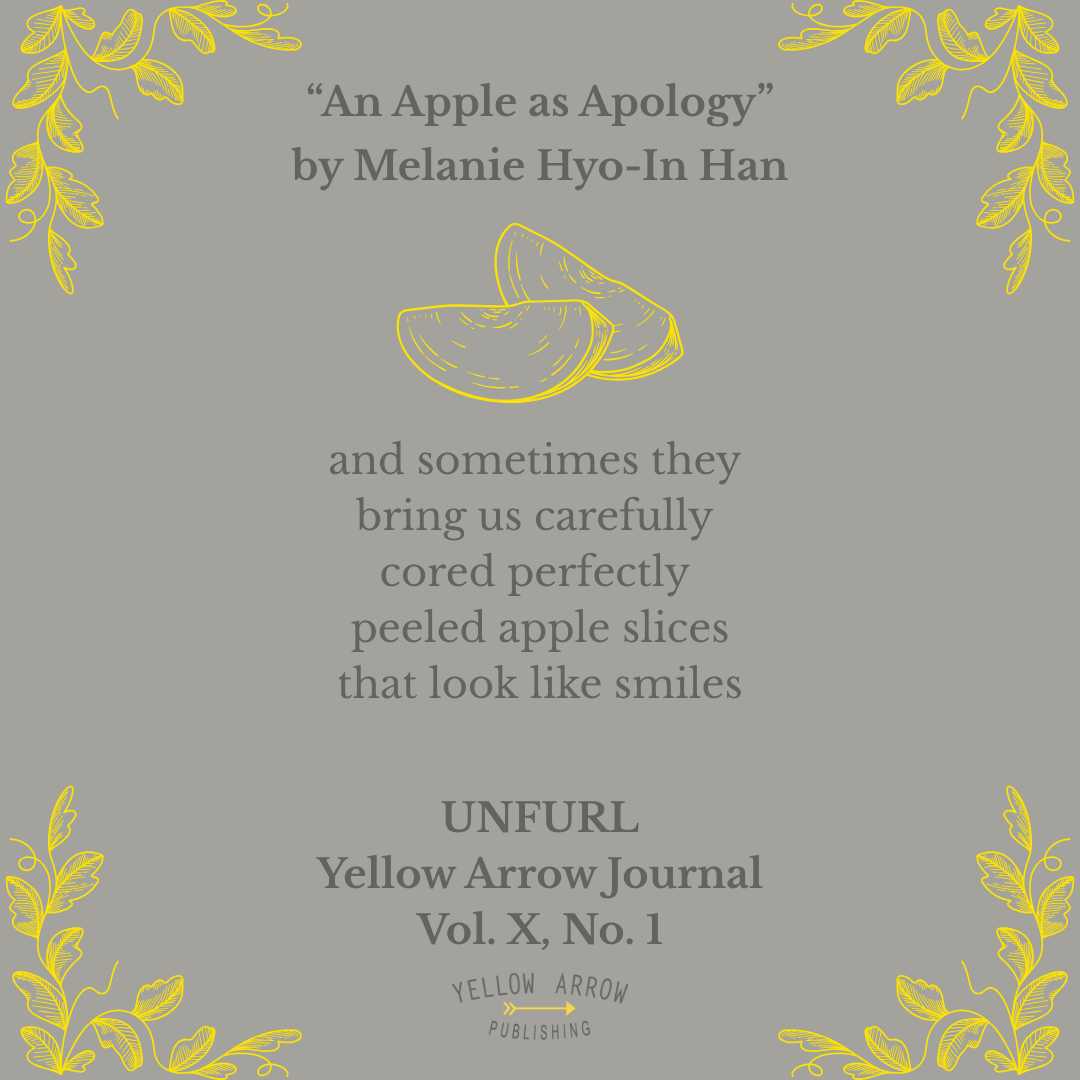 Yellow Arrow published Melanie’s piece “An Apple as Apology” in Yellow Arrow Journal, Vol. X, No. 1, UNFURL. You can find her online on Instagram @melhan and at melaniehan.com.