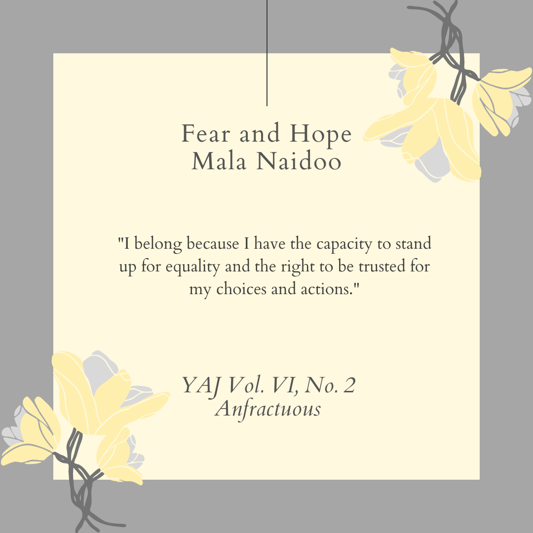 Mala Naidoo is an Australian writer, teacher, and university advisor. She was born in South Africa during the apartheid era which is the impetus for her fictional works which empower the voiceless in a range of societies. Her poignant piece about her journey, “Fear and Hope,” was included in Yellow Arrow Journal, Vol. VI, No. 2, ANFRACTUOUS. Mala participated in “An Exploration of Belonging: The Anfractuous Reading” last year. You can hear her read part of “Fear and Hope” below and find the reading in its entirety on the Yellow Arrow YouTube channel.